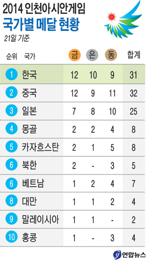 한국은 대회 이틀째인 21일 현재 금 12개, 은 10개, 동메달 9개로 중국(금 12·은 9·동 11)을 은메달 1개 차로 따돌리고 종합 1위를 달렸다.