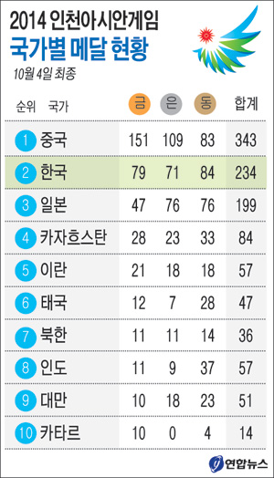 중국이 금 151개, 은 109개, 동메달 83개로 1982년 뉴델리 대회부터 9회 연속 국가별 종합순위 1위를 차지했고 북한은 금 11개, 은 11개, 동메달 14개로 7위에 올라 2002년 부산 대회(9위) 이후 12년 만에 ‘톱10’에 복귀했다.