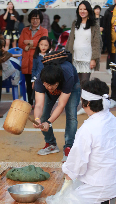 9일 송도세계전통민속제 행사장 내 체험부스에서 한 시민이 찹쌀떡메치기를 하고 있다.
