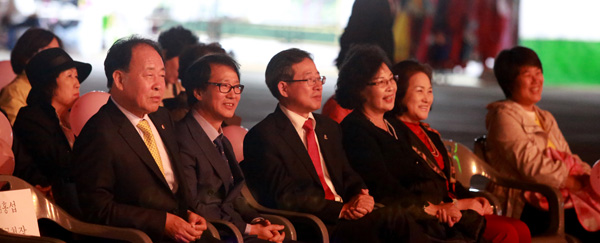 지난 8일 송도세계전통민속제 개회식에 참석한 내빈들. (왼쪽부터) 노경수 인천시의회 의장, 유성보 경기신문 인천본사 대표이사, 배국환 인천시 정무부시장, 김연숙 미퍼스트 국민운동본부 인천시 회장, 이정연 경기신문 인천본사 명예회장