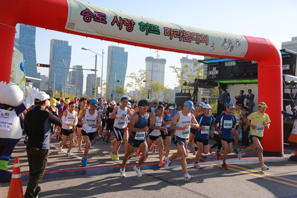 12일 송도세계전통민속제 마지막 날 열린 송도사랑 하프마라톤대회에서 참가자들이 힘차게 출발하고 있다.