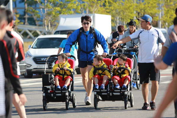 12일 송도세계전통민속제 마지막날 열린 송도사랑 하프마라톤대회에 참가한 탤런트 송일국과 가수 션이 유모차를 몰고 대회장으로 달려오고 있다