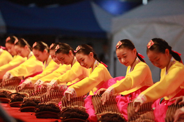 송도세계전통민속제에 초청된 한빛소리 가야금 병창팀이 가야금을 뜯고 있다.