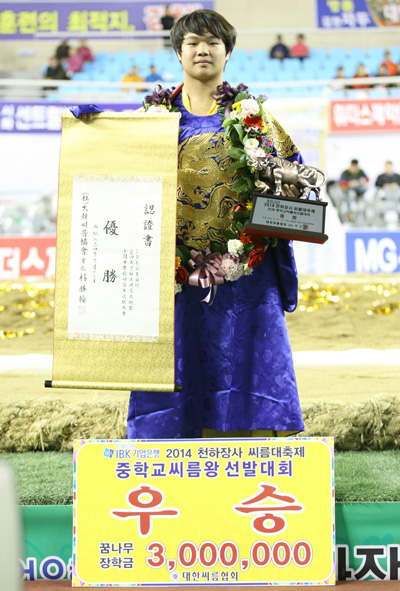 이종학(수원 동성중)이 IBK기업은행 2014 천하장사씨름대축제 전국중·고씨름왕선발대회에서 우승을 차지해 올 시즌 중등부 모래판을 평정하며 전관왕에 등극했다. 이종학은 13일 경북 김천실내체육관에서 열린 천하장사씨름대축제 4일째 중·고씨름왕선발대회 중등부 용사급(80㎏급) 결승전에서 김택균(충북 청주동중)를 2-0으로 제압했다.