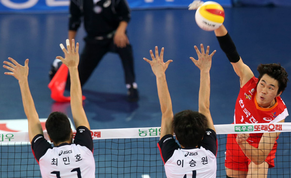한편 천안 유관순체육관에서 열린 남자부 천안 현대캐피탈과 수원 한국전력의 경기에서는 한국전력이 외국인 용병 리버맨 아가메자가 부상으로 빠진 현대캐피탈을 세트스코어 3-0(25-19 25-18 25-21)으로 승리를 거두고 5승3패, 승점 14점으로 인천 대한항공(승점 13점)을 제치고 3위로 올라섰다./정민수기자 jms@