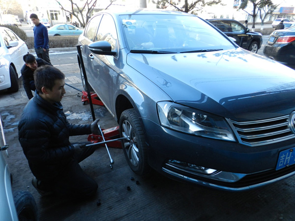 눈이 내린 뒤 도로가 미끄러워지면서 스노우다이야를 교체하려는 운전자들이 많이 늘었다. 7일, 연길시 장백로에 위치한 다이야전문매점의 일군이 고객의 요구에 따라 다이야를 교체해줬다. /심연기자