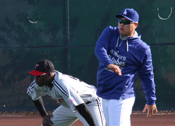 미국프로야구 로스앤젤레스 다저스의 왼손 투수 류현진이 20일(현지시간) 미국 애리조나주 글렌데일의 캐멀백 랜치 스타디움에서 LG 트윈스 선수들과 함께 훈련하기 전 LG 새 외국인 투수 헨리 소사와 담소하고 있다.