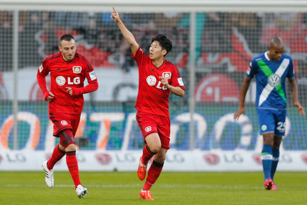 손흥민은 15일 독일 레버쿠젠의 바이아레나에서 열린 볼프스부르크와의 2014~2015 독일 프로축구 분데스리가 21라운드 홈 경기 후반 12분과 후반 17분, 후반 22분 연달아 골을 폭발했다.