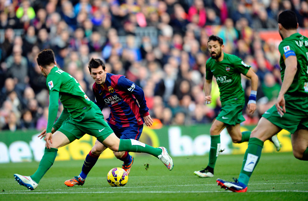 메시는 16일 스페인 바르셀로나의 캄프누에서 열린 2014~2015 프리메라리가 23라운드 FC바르셀로나와 레반테와의 경기에서 3골을 몰아쳤다.