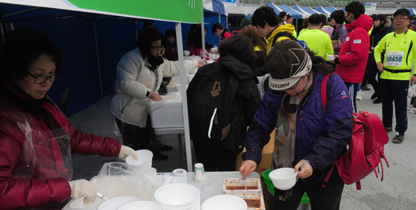 ○…지난 달 28일 쌀쌀한 날씨 속에 수원종합운동장에서 펼쳐진 2015 경기국제하프마라톤대회에서 마라톤 마니아들에게 다양하고 따뜻한 먹거리가 제공돼 눈길을 끌었다,