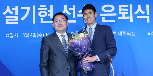 축구 국가대표 출신 공격수 설기현(36)이 4일 서울 종로구 축구협회 대회의실에서 은퇴식을 하고 선수 생활을 마무리했다.