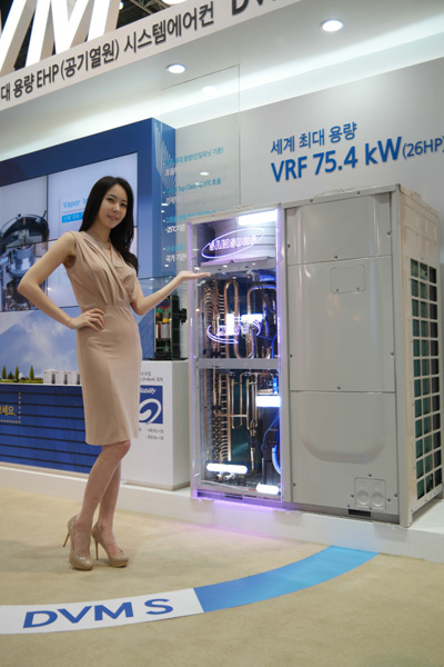 삼성전자 모델이 10일 일산 킨텍스에서 열린 ‘제13회 한국국제냉난방공조전(HARFKO 2015)’에서 시스템에어컨 중 세계 최대인 75.4kW(26마력)의 용량을 갖춘 ‘DVM S’를 소개하고 있다. 삼성 시스템에어컨 'DVM S'는 기존 제품보다 실외기 설치 공간은 약 40%, 하중은 약 30%를 줄였으며, 혹한에서의 난방 성능도 20% 향상시켰다. /삼성전자 제공
