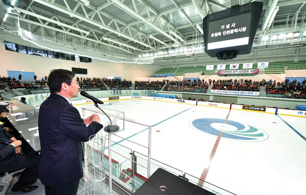 선학국제빙상경기장 ‘문 활짝’… 기념사하는 유정복 시장