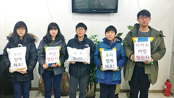더 보이스 학생기자들을 주축으로 한 ‘라이스 버킷 챌린지’가 지난 2월 8일 첫 도전을 시작했다. 이날 쌀 5kg을 들고 도전에 나선 학생은 송주영(보정고), 이승용(신봉고), 김민석(성지중), 조수빈(백현중), 김범수(청덕중) 학생 등 모두 5명이다.