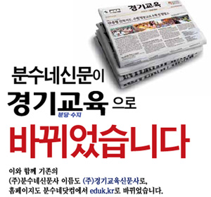 분수네신문이 오늘자 신문부터 ‘경기교육 분당·수지판’으로 제호를 바꾸고 온-오프라인을 아우르는 주간 교육전문신문으로 새롭게 출발합니다. 이와 함께 기존의 (주)분수네신문사 이름도 (주)경기교육신문사로, 홈페이지도분수네닷컴에서 eduk.kr로 바꾸었습니다.