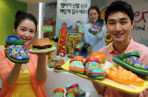 13일 오전 서울 중구 크록스 명동점에서 모델들이 세계적인 그래피티 아티스트 존 버거맨(Jon Burgerman)과 콜라보레이션한 슈즈 ‘크록밴드 버거 클로그(Crocband burger clog’'를 선보이고 있다.