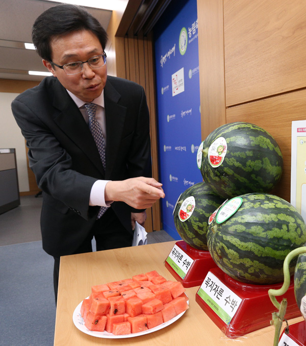 농림축산식품부는 이달부터 ‘수박 꼭지절단 유통 활성화 방안’을 추진, 꼭지를 잘라낸 수박을 시중에 시범 유통한다고 14일 밝혔다.여름철에 사랑받는 과일인 수박은 대부분 꼭지가 ‘T’ 모양으로 다듬어져 유통된다.수박 신선도를 판단하는 기준으로 꼭지가 활용되기 때문이다. 그러나 충남대 산학협력단이 최근 실시한 ‘수박 꼭지 절단 유통개선 연구’에 따르면 유통기간 내 수박은 꼭지 부착 여부에 따라 경도, 당도, 과육 색 등에 차이가 없었다.또 산지 유통시설 현대화가 이뤄져 많은 수박 산지가 당도선별기 등을 갖추고 당도 11브릭스 이상의 수박만 출하한다.소비자가 꼭지에 의존하지 않아도 품질 좋은 수박을 먹을 수 있다는 게 농식품부의 설명이다. /연합뉴스