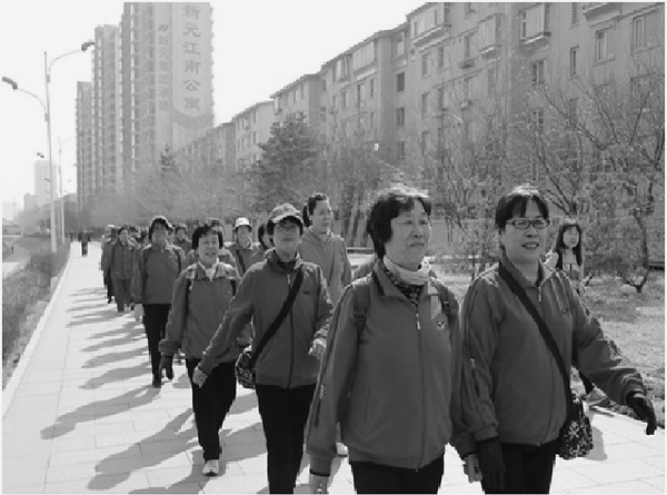 14일 상큼한 아침,빨간 웃옷에 검정 운동복 바지를 멋지게 차려입은 40여명의 로인들은 스트레칭을 하고있었다. 로인들은 함께 허리도 돌리고 팔도 뻗으며 몸을 풀었다.하남가두 흰국화사회구역 로년과학보급대학도보팀이 도보활동을 재개한것이다.