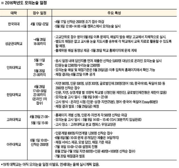 일정을 확정했다. 나머지 21개 대학 중 연세대는 올해 모의논술 계획이 없다고 밝혔고 울산대는 의예과만 실시하기 때문에 운영하기가 어려울 것으로 보인다. 나머지 1개 대학은 수시요강이 확정되는 오늘(30일)과 5월 1일을 전후로 일정을 공지할 것으로 보인다.