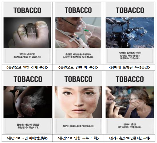 지난 2월 임시국회에서 제동이 걸렸던 담뱃갑 경고그림 의무화 법안(국민건강증진법 개정안)이 6일 국회 법제사법위원회 전체회의를 통과했다. 이 법안은 담배 제조사가 담뱃갑 앞뒷면 면적의 50% 이상을 경고그림과 경고문구로 채우고 이 가운데 경고그림의 비율이 30%를 넘도록 하는 내용을 담고 있다. 복지부의 연구용역 의뢰로 한국건강증진개발원이 예시로 만든 담뱃갑 흡연 경고 그림 시안./연합뉴스