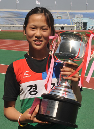 “최선을 다한 경기에서 좋은 결과를 얻어 기뻐요. 최우수 선수에도 선정돼 행복합니다.” 31일 제주종합경기장에서 열린 제44회전국소년체육대회 육상 여자초등부에서 2관왕에 오르며 최우수선수에 선정된 김다은(가평초)의 소감.
