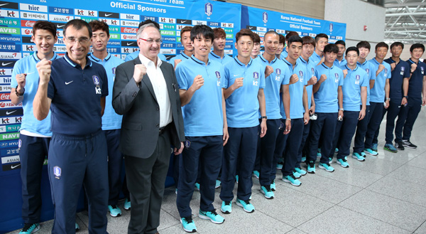 슈틸리케 감독을 필두로 코칭스태프와 태극전사들은 출국에 앞서 취재진 앞에서 승리를 기원하는 ‘파이팅 세리머니’를 펼쳤다.