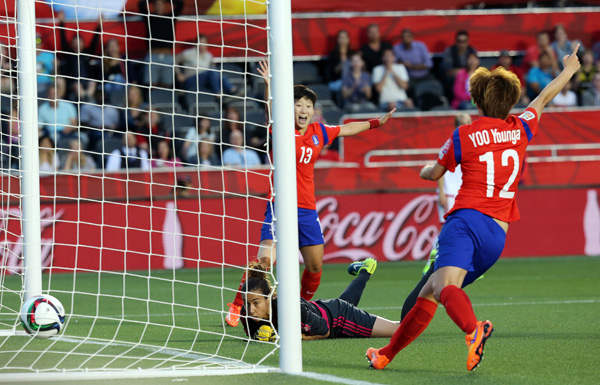 윤덕여 감독이 이끄는 한국(FIFA 랭킹 18위)은 18일 캐나다 오타와에서 열린 조별리그 E조 3차전 스페인(14위)과의 경기에서 전반 29분 스페인 베로니카 보케테에게 먼저 한 골을 내줬으나 후반 8분 조소현(현대제철)의 동점 헤딩골과 후반 33분 김수연(KSPO)의 역전 골을 묶어 2-1로 짜릿한 역전승을 거뒀다.