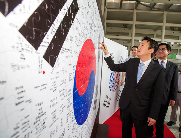 태극기 촬영존 보는 南 지사