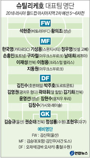 또 예비명단에는 오재석(감바 오사카), 홍철(수원·이상 DF) 김승대(포항) 김민우(사간 도스·이상 MF) 김신욱(FW·울산) 등이 이름을 올렸다.