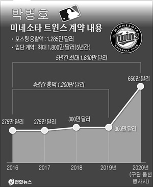 박병호는 일단 2016년부터 2019년까지 1천150만 달러를 보장받고, 2020년에 미네소타에서 뛰지 않으면 바이아웃 조항에 따라 50만 달러를 받아 1천200만 달러를 채운다.