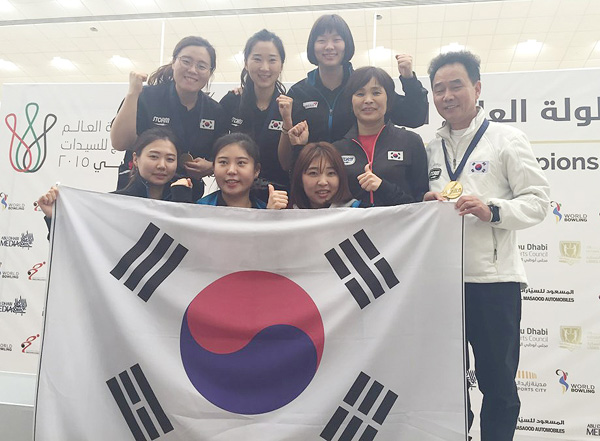 2015 세계여자볼링선수권대회에서 챔피언에 오른 한국 국가대표팀.