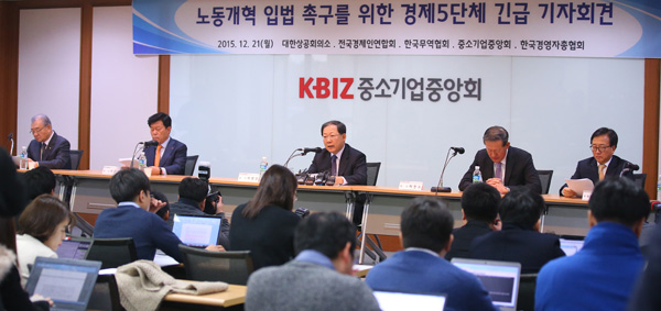 허창수 전경련 회장, 박병원 경총 회장, 이동근 상의 부회장, 김인호 무협 회장, 박성택 중기중앙회 회장은 이날 여의도 중소기업중앙회에서 연 기자회견에서 “노사정 대타협을 이뤄낸 지 벌써 3개월이 지났고 정년 60세 시행도 열흘 밖에 남지 않았다”며 국회에 계류 중인 노동개혁, 경제활성화 법안의 조속한 처리를 촉구했다.