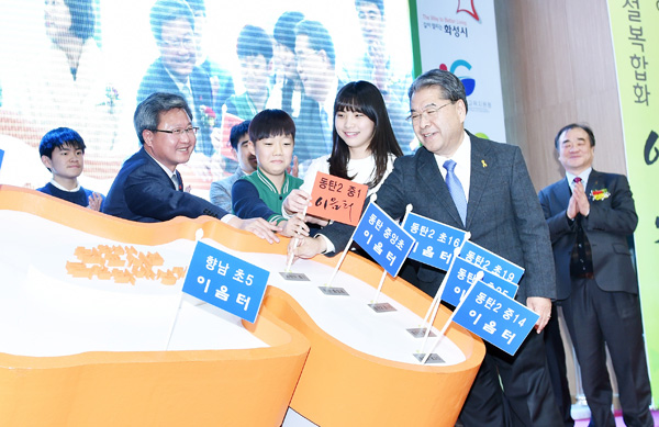 2. 이재정 경기도교육감이 지난 29일 오후 화성시 동탄중앙초등학교에서 열린 '동탄2 중1 학교시설복합화 업무협약식에 참석, 기념촬영을 하고 있다.
