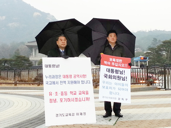 4. 이재정 경기도교육감과 강득구 경기도의회의장이 청와대 앞에서 ‘누리과정은 대통령 공약사항! 국고에서 전액 지원해야 합니다’라고 쓰인 피켓을 들고 시위를 벌이고 있다.