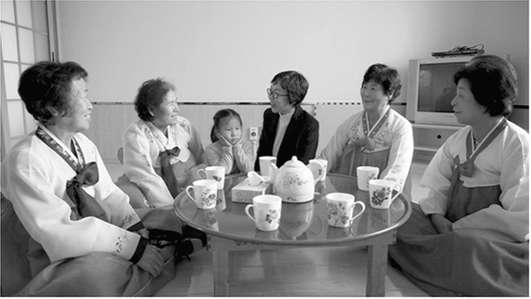 애심오락실 입구는 조선족전통가옥의 회색기와를 얹고 처마에는 나무를 대여 민속특색이 다분했다. 애심오락실에는 알록달록 민족복장을 차려입은 할머니들이 조선족밥상주변에 동그랗게 모여앉아 커피 한잔 나누며 설기간 못 만난 회포를 풀고있었다.