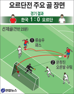 한국은 전반 23분 왼쪽 측면에서 권창훈(수원)이 크로스를 올렸고, 요르단 수비진이 우물쭈물하는 사이 류승우(레버쿠젠)가 골지역 오른쪽에서 잡아 쇄도하는 문창진에게 패스했다.