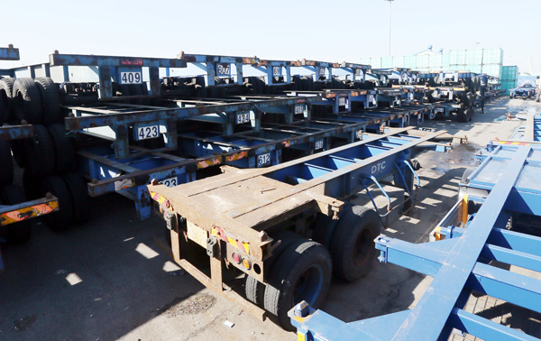 일거리가 줄어 쌓여있는 컨테이너 운반 트레일러