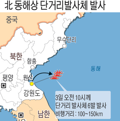 합동참모본부는 “북한군은 오늘 오전 10시쯤 강원도 원산 일대에서 동해상으로 단거리 발사체 6발을 발사했다”고 밝혔다.