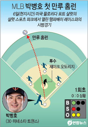한국프로야구 KBO 리그 4년 연속 홈런왕 박병호(30·미네소타 트윈스)가 메이저리그(MLB) 첫 홈런을 만루포로 장식했다.