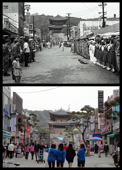 70년대 팔달문 옆에 예비군과 학생들이 줄지어 서 민방공 훈련을 하던 사진과 행인들이 즐겁게 걸어 다니는 같은 장소 모습이 비교되고 방화수류정 옆 피난민의 판잣집이 즐비하던 모습과 현재 공원으로 정비된 모습을 함께 볼 수 있다.