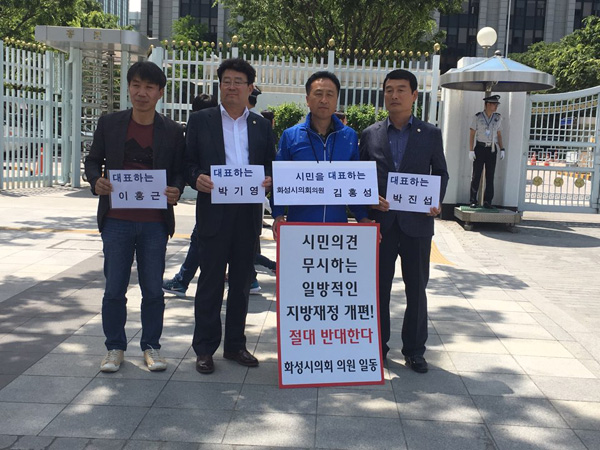 이날 1인 시위에 참여한 시의회 박기영·김홍성·박진섭·이홍근 의원이 “지방재정제도 개편안은 지방자치 본질과 독립성을 훼손하는 것으로 화성시는 2,700억 원의 세입결손이 예상된다”며 “시민과 밀접한 사회 안전망에 대한 교육·의료, 공공투자사업에 대한 축소와 쓰레기봉투 값, 상하수도요금, 공용주차장 요금의 인상이 불가피하다”고 주장했다.