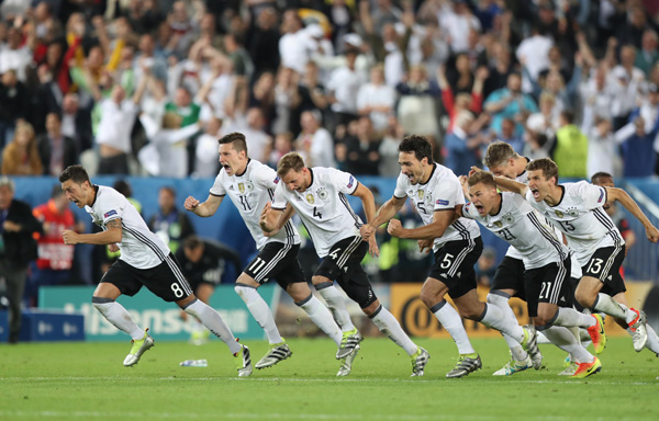 독일은 3일 프랑스 보르도의 스타드 드 보르도에서 치러진 유로 2016 8강전에서 ‘아주리 군단’ 이탈리아와 120분 연장 혈투 끝에 1-1로 승부를 내지 못한 뒤 승부차기에서 6-5로 극적으로 이겨 4강에 진출했다.