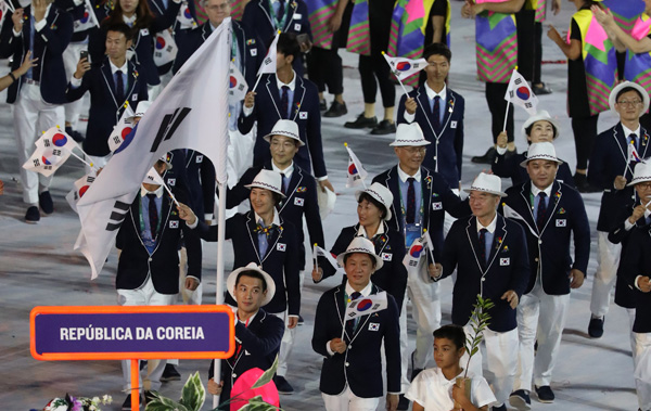 펜싱 국가대표 구본길(27·국민체육진흥공단)이 기수를 맡았고 정몽규 선수단장을 비롯한 50여 명의 선수단이 행진했다.