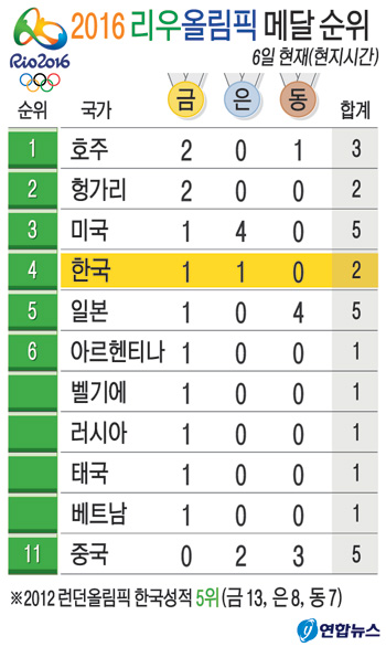 미국이 금 1개와 은메달 4개로 3위고, 일본은 금 1개와 동메달 4개를 따내 한국 다음인 5위에 자리했으며 중국은 금메달 없이 은 2개와 동메달 3개를 획득, 11위로 첫날 경기를 마쳤다./연합뉴스