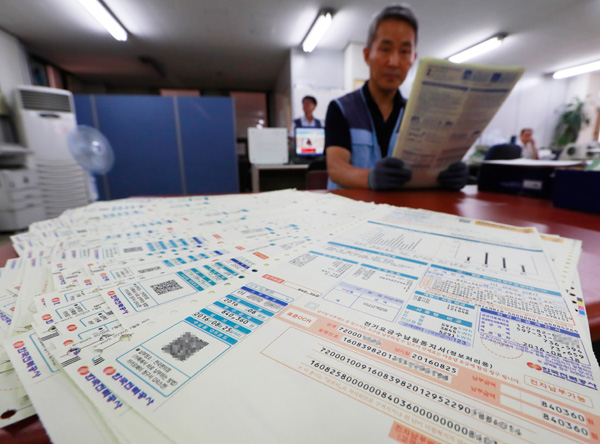 최근 폭염이 이어지며 에어컨 사용이 늘어난 각 가정 및 업소에서 ‘전기료 폭탄’ 우려가 커지고 있다. 16일 오후 서울 중구 한국전력 서울지역본부 관계자가 전기료 고지서를 정리하고 있다. 사진 속 고지서는 서울 시내 한 상업시설의 고지서로 전월 대비 전력 사용량이 약 55% 증가하며 84만360원의 납부요금이 청구돼 있다./연합뉴스