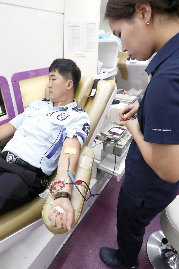 7일 오후 인천시 남동구 인천시청 앞에서 시청 경비부서 직원이 헌혈하고 있다. /연합뉴스
