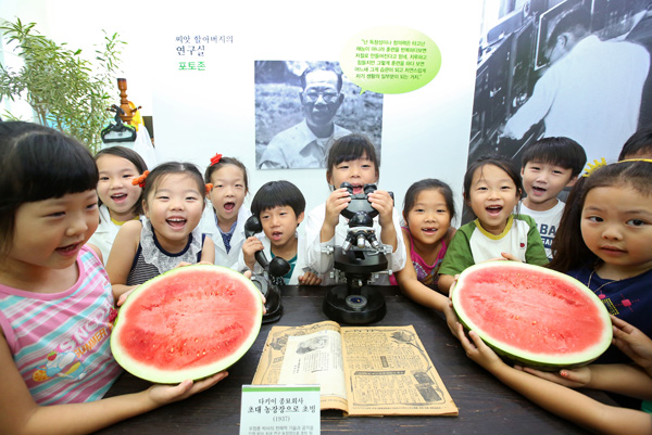 23일 전북 전주시 농촌진흥청 농업과학관에서 열린 ‘우장춘 박사 특별전’에서 어린이들이 씨 없는 수박을 살펴보고 있다. 이번 특별전은 오는 31일까지 9일 동안 진행된다./농촌진흥청 제공