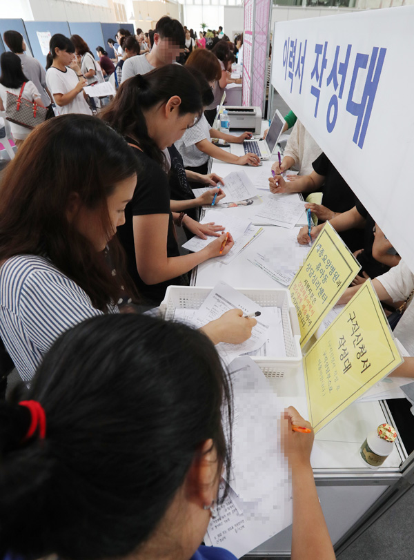 25일 오후 세종시 세종포스트 빌딩에서 열린 ‘2016 여성취업 구인구직 만남의 날’ 행사에서 구직여성들이 서류를 작성하고 있다./연합뉴스