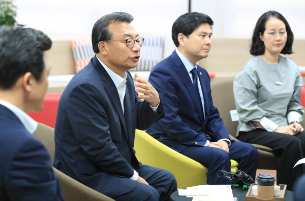 이정현 새누리당 대표가 ‘문화가 있는 날’(매월 마지막 수요일)인 31일 오후 서울 중구 다동 문화창조벤처단지를 방문, 현장 예술인들과 간담회를 하고 있다./연합뉴스