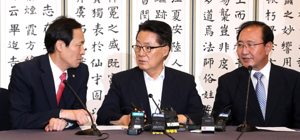 국민의당 박지원 원내대표(가운데)가 5일 오후 국회 귀빈식당에서 열린 야3당 원내대표 회동에서 더불어민주당 우상호 원내대표(왼쪽), 정의당 노회찬 원내대표(오른쪽)와 야당 반대에도 임명이 강행된 김재수 농림축산식품부 장관과 조윤선 문화체육관광부 장관에 대한 대처방안을 논의하고 있다./연합뉴스